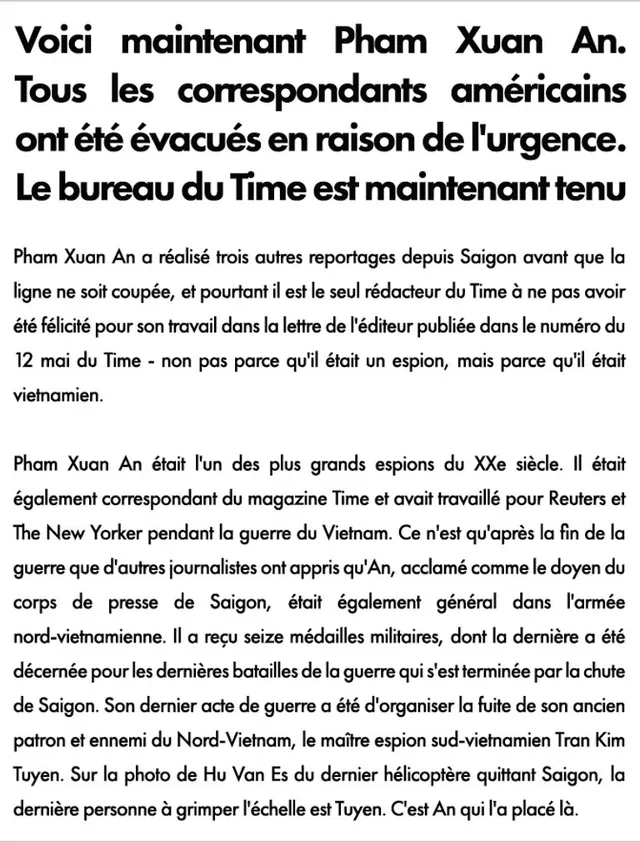 “Here is Pham Xuan An now. All American correspondents evacuated because of Emergency. The office of Time is now manned by Pham Xuan An.”